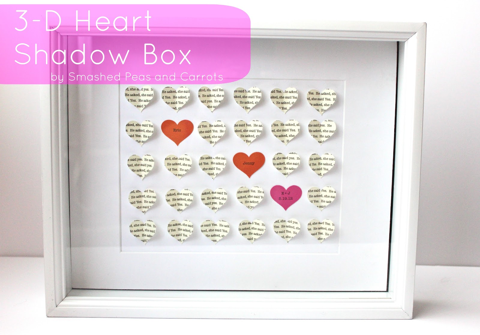 What a great idea! Love it! I made one yesterday for my sister who is getting married. I used just a regular frame and glued the hearts down flat. It looks fantastic! Thank you for sharing! -Kirsi