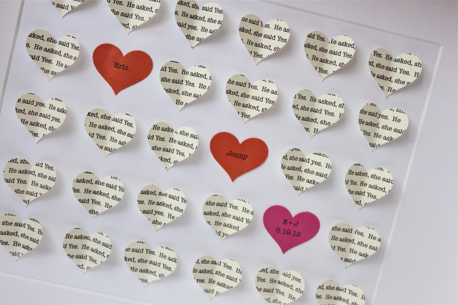 I bought a few sheets of 8 1/2 x 11″ scrapbook paper in their wedding colors, orange and hot pink, that I printed their names on as well as their wedding date and punched out with the heart punch. I also bought a few sheets of cream colored paper to print off the repeated sweet saying I chose for them, “He asked, and she said Yes.” so that it looked like a poem from an old book. I bought one sheet of white scrapbook paper to go behind the mat as a background since the shadow box had a black velvet material for the background and then just used the glue dot tape to keep it in place although hot glue would probably work just as well.
