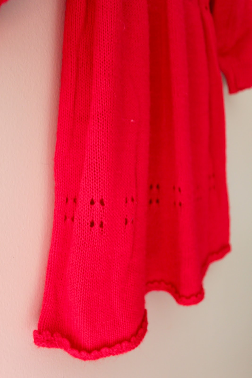 I love all the little detail that was put into this dress from the little flowers knitted onto the front, the sweet little eyelets across the skirt portion of the dress and then right down to that lovely reverse scalloped hem.