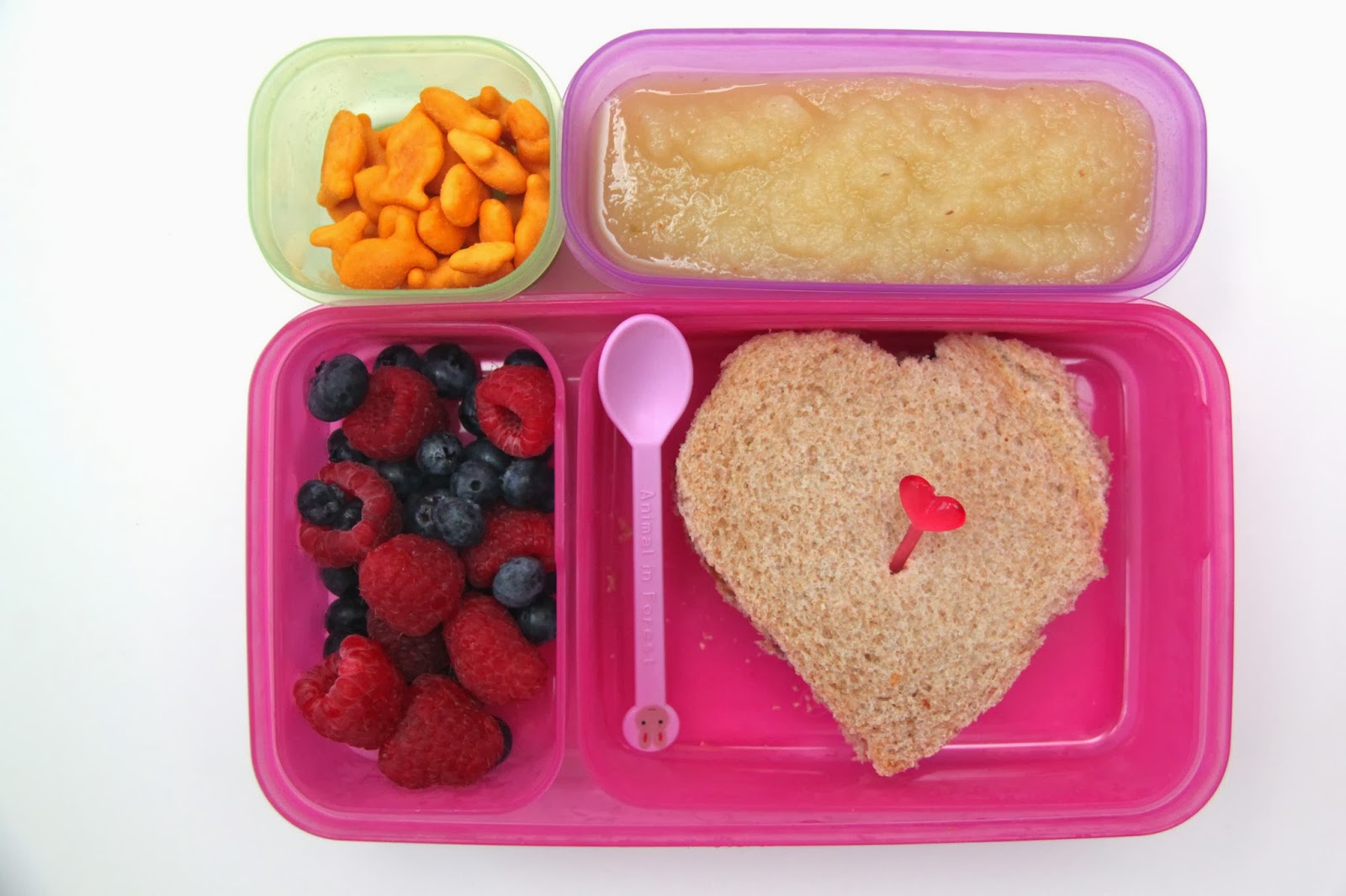 Lunch 4: Clementines segments, raspberries and blueberries, Tetris-shaped ham sandwiches, organic animal crackers.