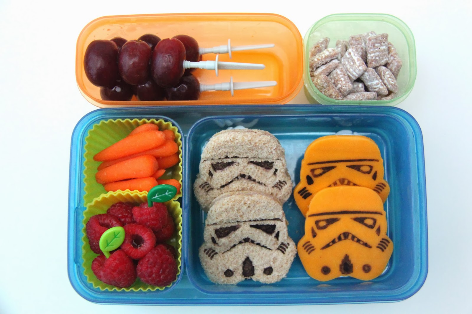 Lunch 3: Star Wars theme! Light saber-skewered grapes, puppy chow made with almond butter, raspberries with leaf picks, baby carrots, storm trooper ham sandwiches, and storm trooper cheese slices.