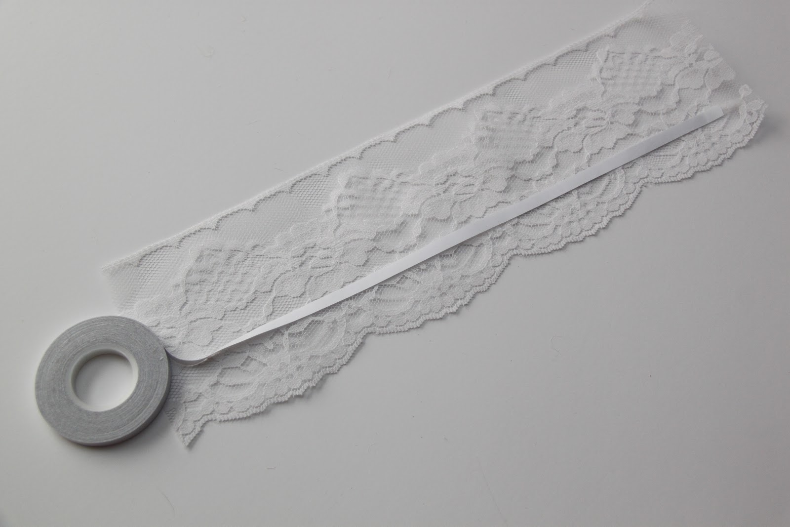 Next cut 13 inch sections of the lace. I loved this vintage trim I had in my stash for this particular project. It’s about 4 inches wide and has the loveliest scalloped edge on one side. I placed a 13-inch strip of wondertape near the scalloped edge to keep the trim in place while I sewed it down.