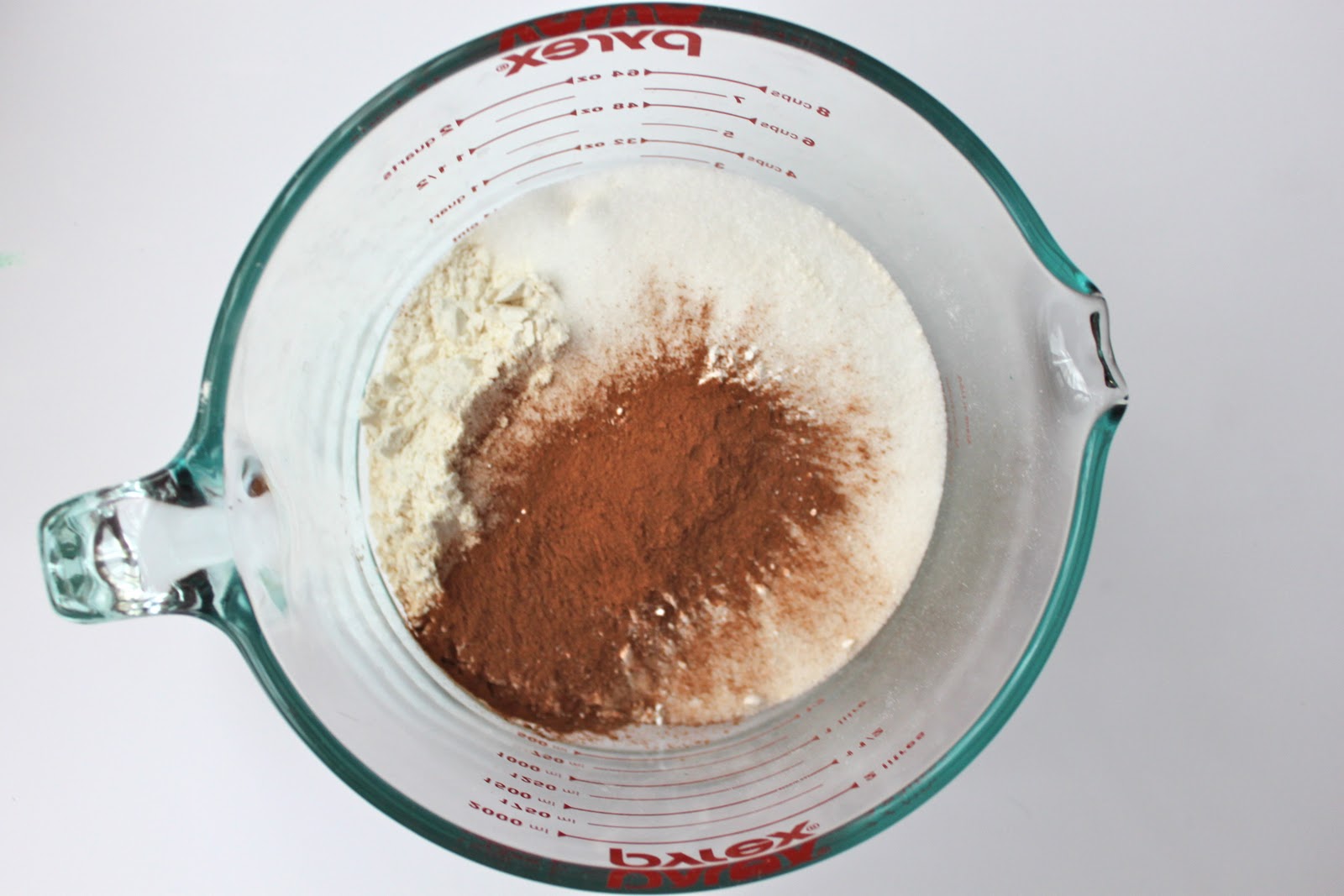 - Next, combine flour, sugar, baking powder, cinnamon and salt in a bowl and set aside.