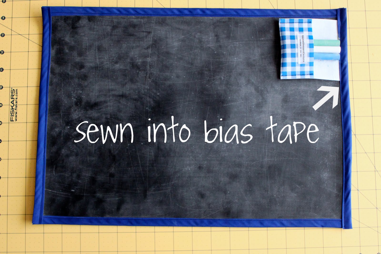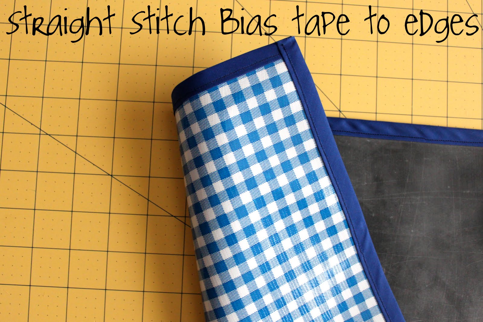 Then, grab your bias tape and open it so you can see the two fold edges facing inward. Place the center crease so that it’s flush with the edge of the chalk/oilcloth edge. You should now have one fold on the chalkcloth side and the other fold on the oil cloth side. *I cut the bias tape for each edge separately and stitched it into place, this way I avoided having to bend the bias tape around the corners of the placemat 🙂
