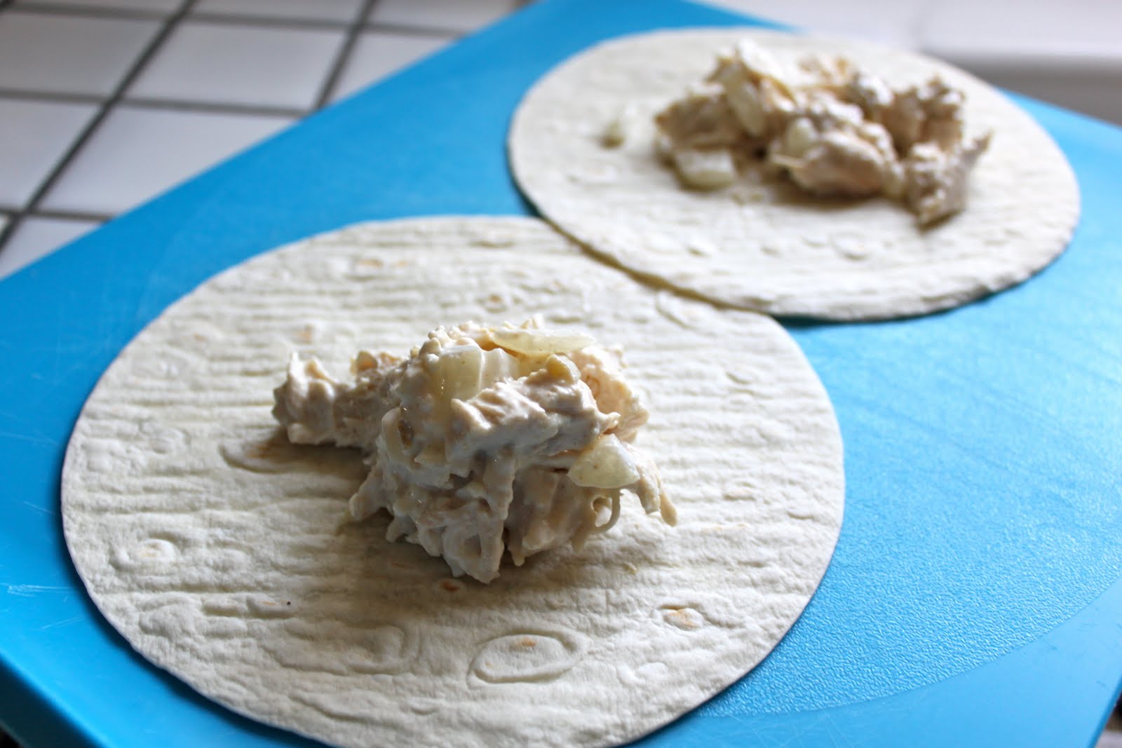 - Place 3-4 tablespoons of the chicken mixture in the middle of each tortilla and roll up.