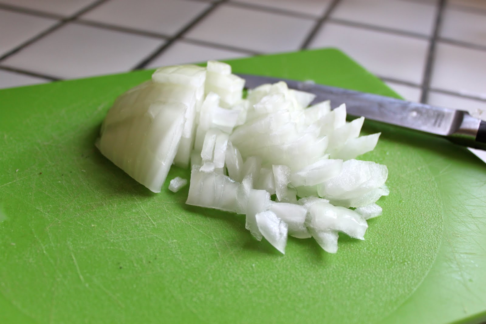 First, dice up your 1/4 cup of onion. If you already have some cooked chicken you can just place the onion into a saute pan with some butter and a tablespoon of green chiles and cook until the onions are translucent.