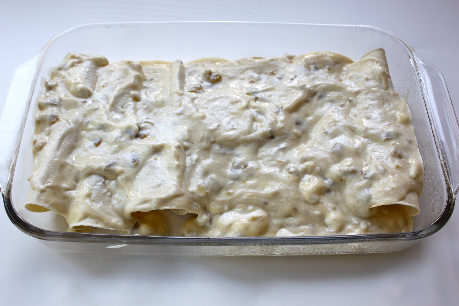 - Place 3-4 tablespoons of the chicken mixture in the middle of each tortilla and roll up.