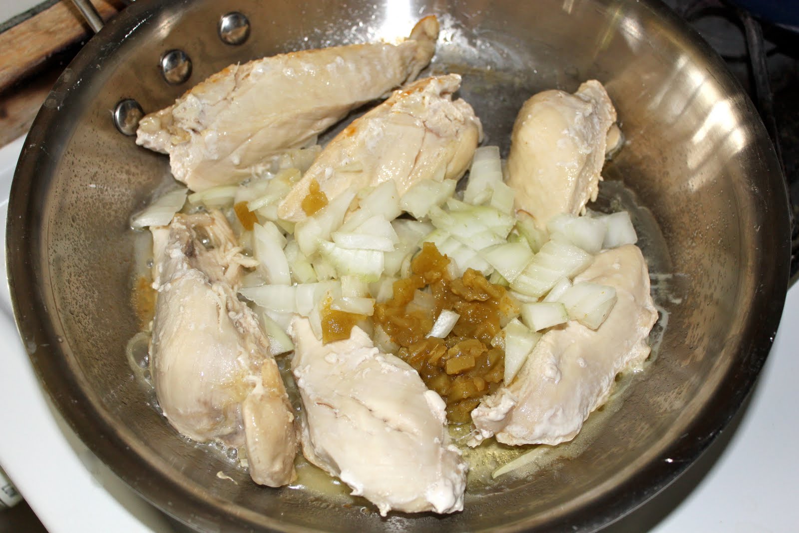 I like to add in my onion and the tablespoon of green chiles when my chicken is almost completely cooked through. Then, just cook just until the onions are translucent…oh, and your chicken is cooked all the way through (yeah, that’s a for sure!)
