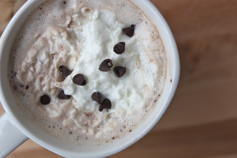 6. After about 10 minutes, pour into mugs and serve with a dollop of whipped cream and a sprinkle of mini chocolate chips.