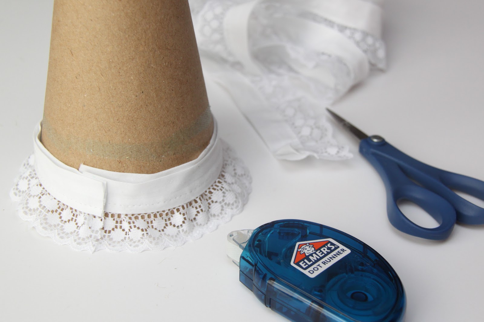 All you need to do to start is to roll the tape near the base of the cone (or use your glue gun!) I cut strips one by one as they will need each need to be slightly smaller as you go up your cone. I also cut the lace slightly larger than the circumference of the cone so it would overlap a bit when I glued the trim down. Do this the entire way up until you get to the tip and just make sure you cover the tip well! Also, make sure you start your rows of trim at the same spot so you have a nice seam up the back you can put against the wall. To be honest, you can’t really tell the seam is there but if it at all bothers you just do it that way!