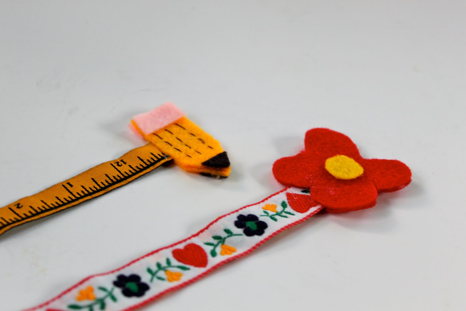 For this little pencil bookmark, I used yellow, pink and dark brown felt scraps. I hand stitched the pencil lines with some regular sewing thread and a hand needle. Easy Peasy!!