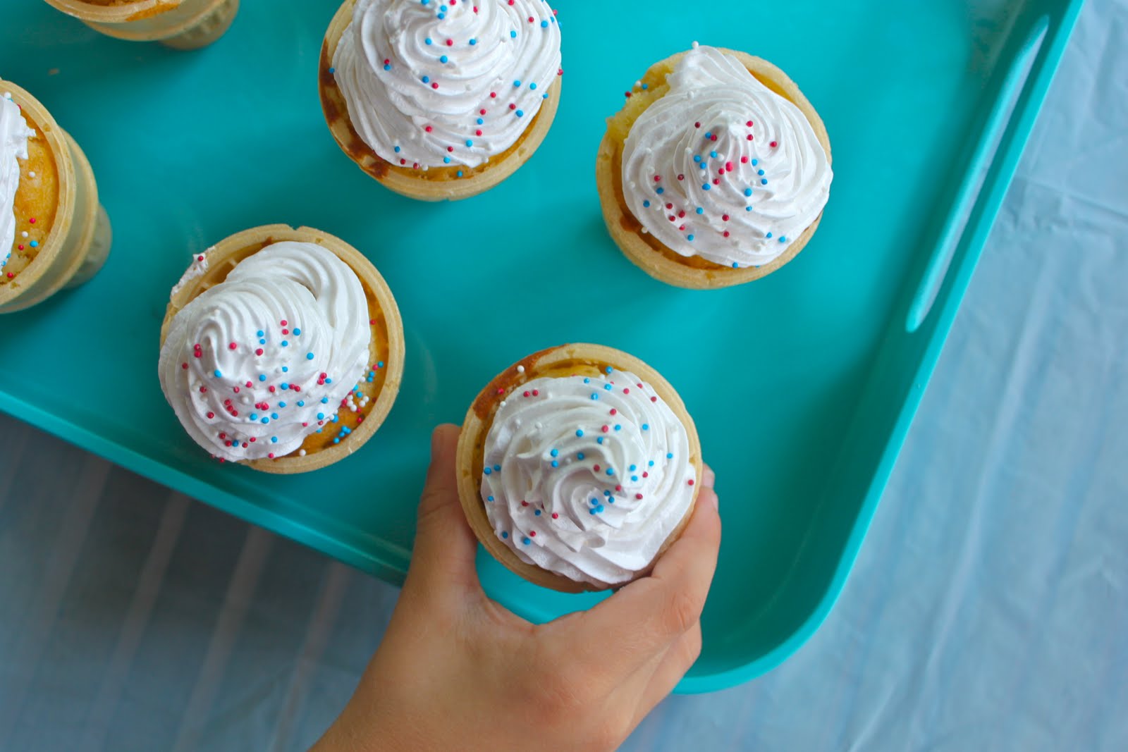 I made a few trays of cupcakes in a cone to pass out to our guests, these were great as there was no cupcake wrapper to peel and all the stickiness and crumbs that go with it. I used my favorite marshmallow-y frosting, you can find it here…love this stuff! It truly does look like it’s real soft serve ice cream on top!!