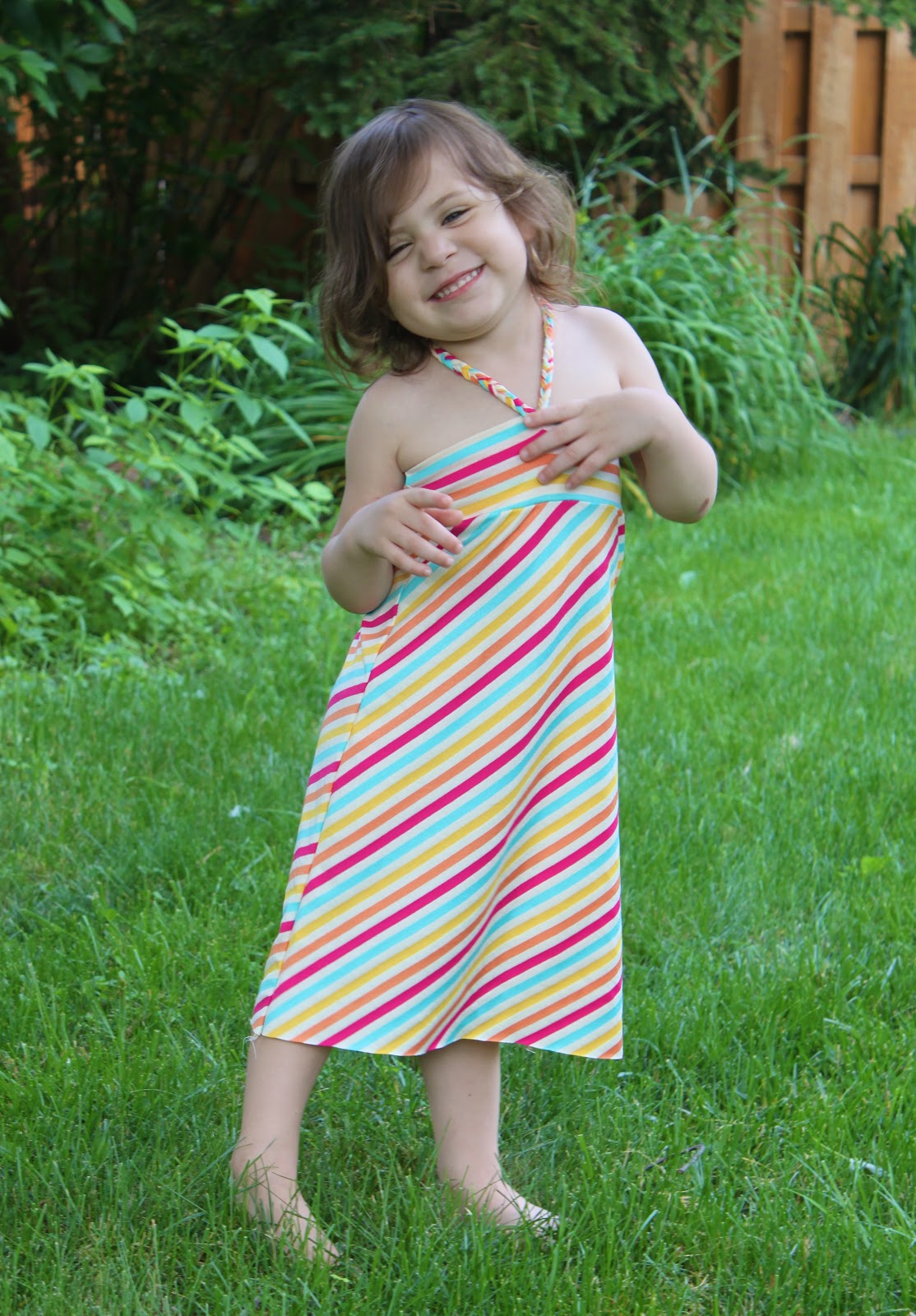 I found this awesome colorful striped jersey knit at Joann’s, I thought would be perfect for a little girl’s dress. Doesn’t it remind you of a lollipop? You can find lots of fun jersey knits at your local Joann’s or Hancock Fabrics in the clearance section as well as for 40% off if you look there every other week or so…this dress only cost me $3 in material!!