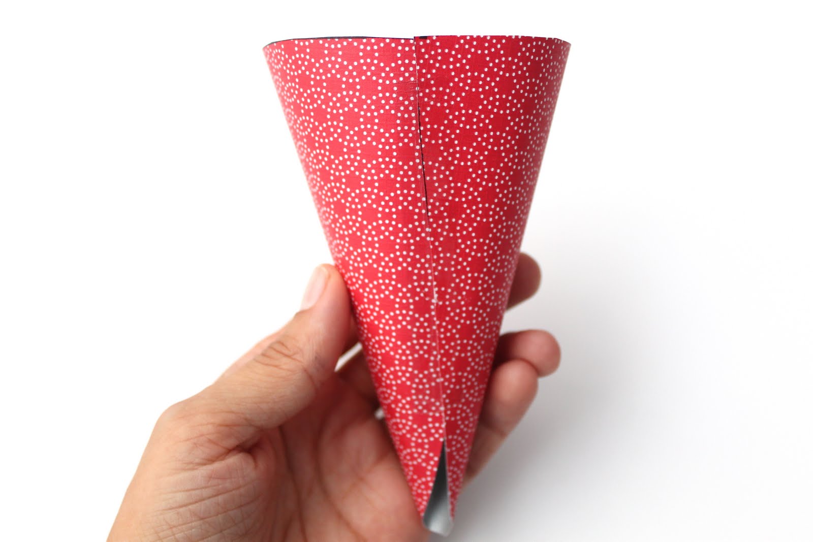 Then place a 4 inch piece of transparent tape on the remaining flap of paper on the outside of the cone. Press both pieces of tape down making sure that they are holding well. See you can’t even see the transparent tape 🙂