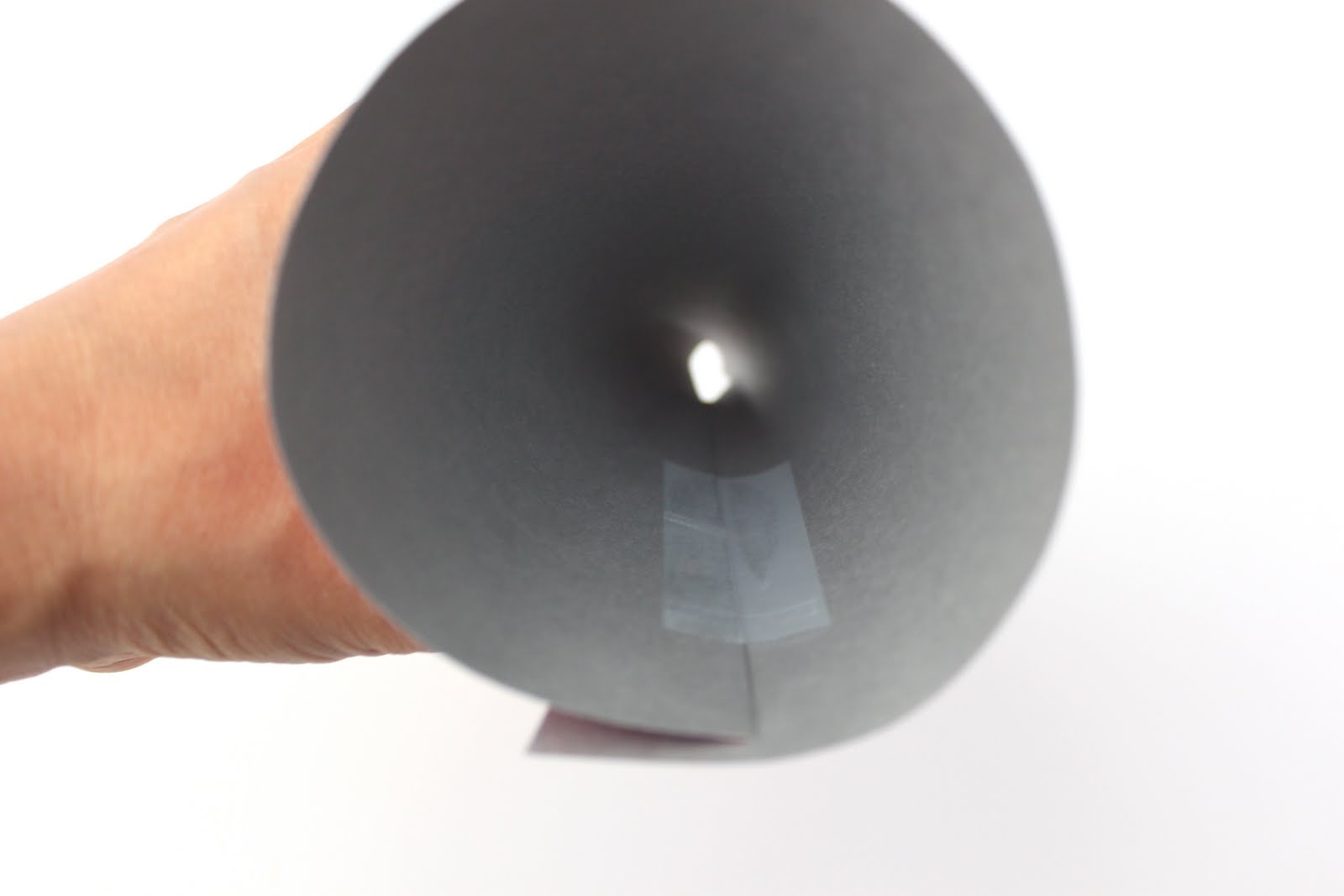 Then place a 4 inch piece of transparent tape on the remaining flap of paper on the outside of the cone. Press both pieces of tape down making sure that they are holding well. See you can’t even see the transparent tape 🙂