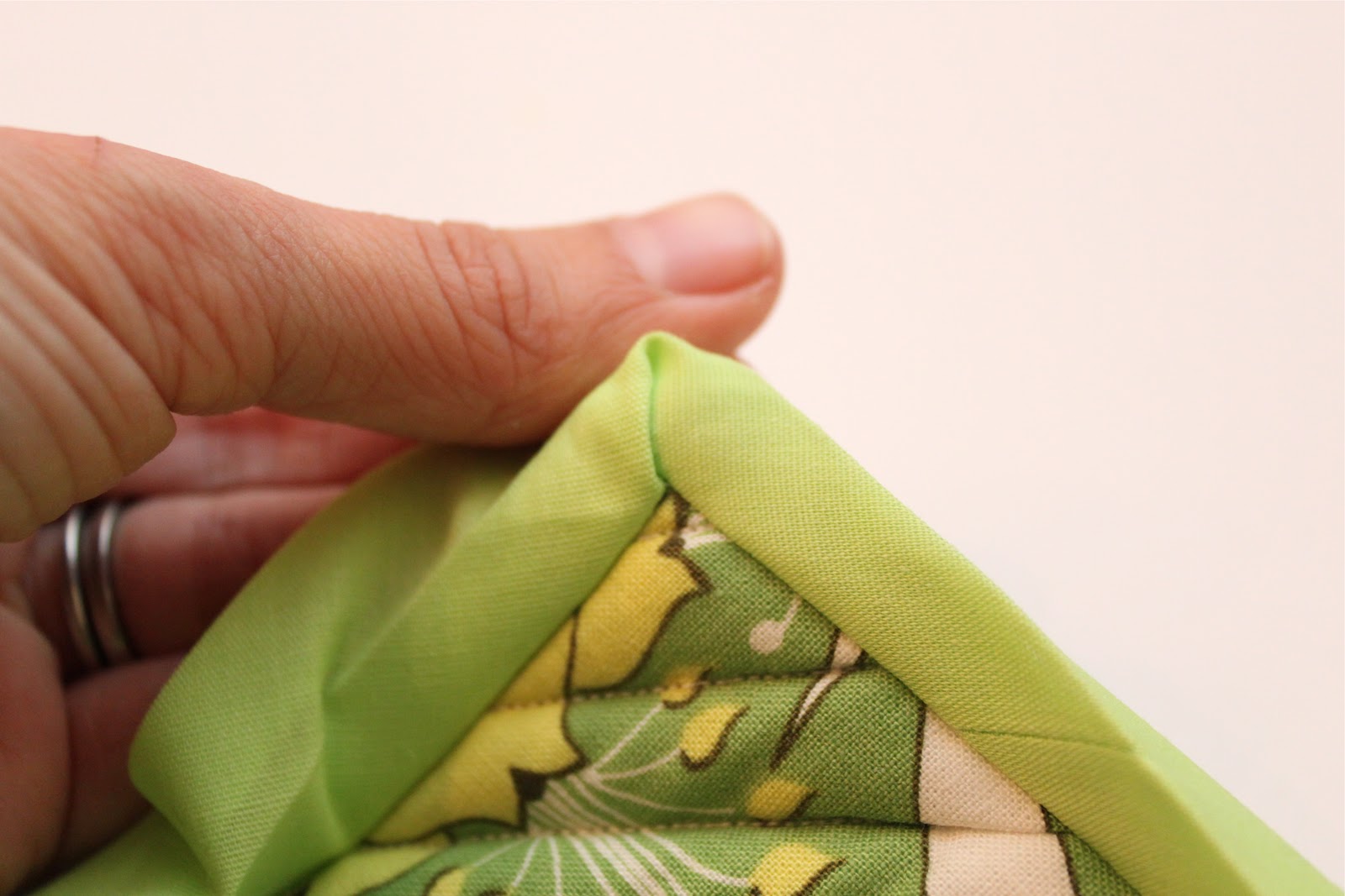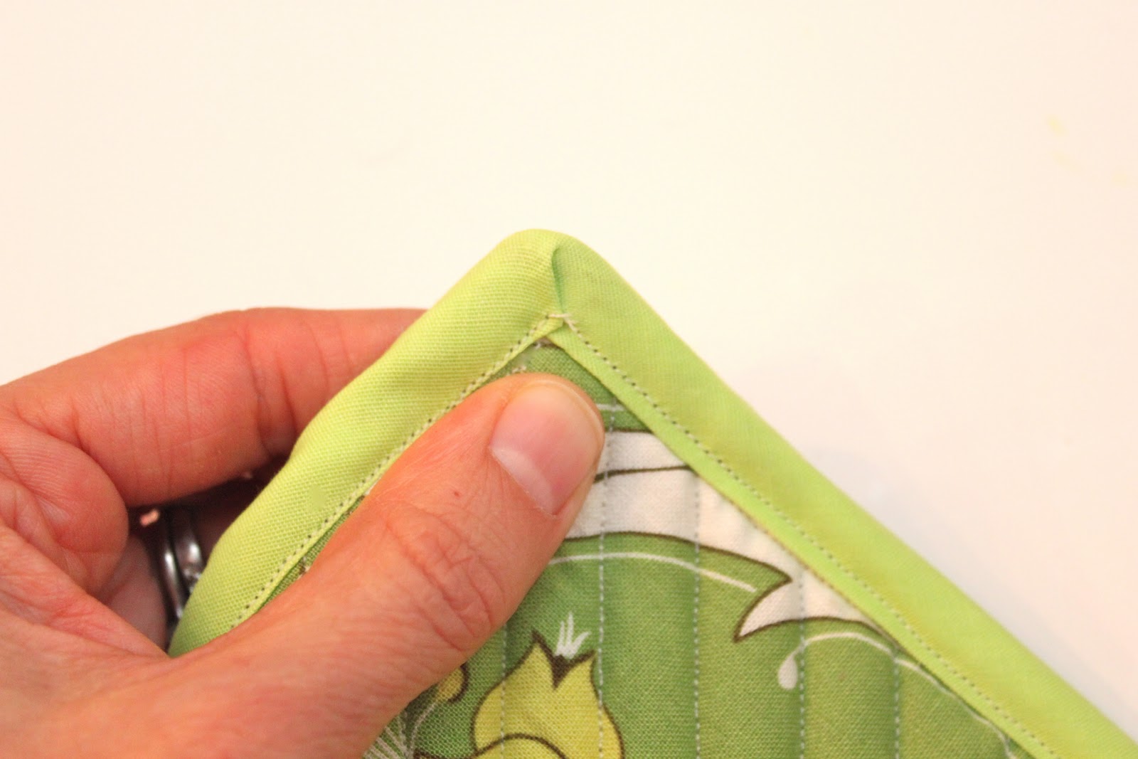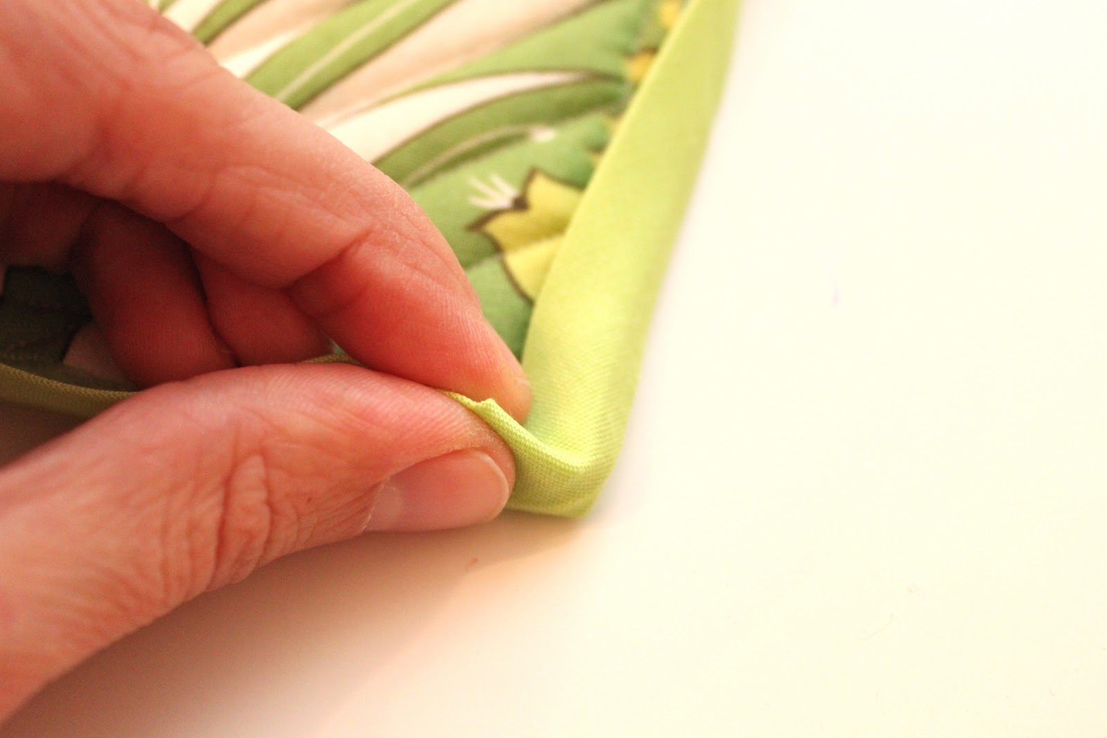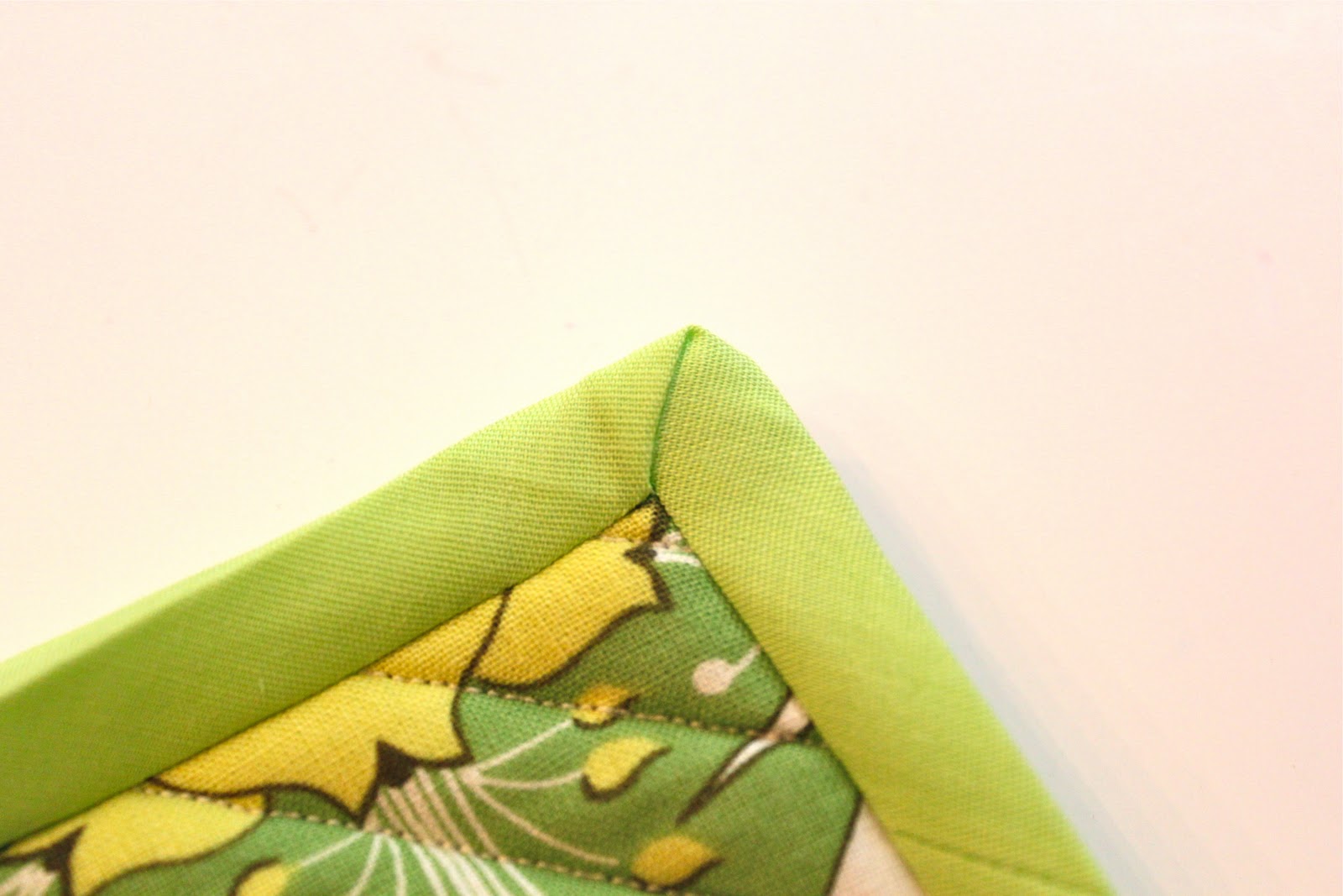 So here is what the front or right-side of your mug rug/potholder should look like at the corners as you are flipping the bias tape back to the other side. As you flip the corner you are going to ease the tape into a ‘mitered’ corner on the back side.