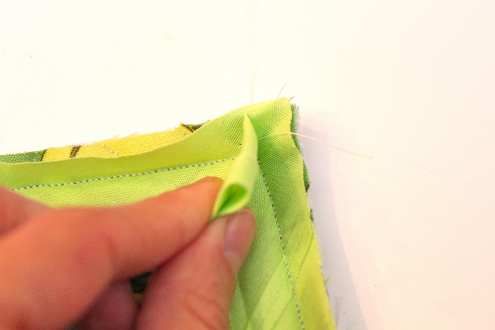 Now, just continue sewing each side just like this. After you have sewn EACH SIDE SEPARATELY (starting at one corner, stitching down the crease, stopping about 1/4 inch from the edge of your fabric and then backstitching and cutting your thread) you will be ready to flip your corners. Sounds fun, right!?! Good, cause it totally is!!