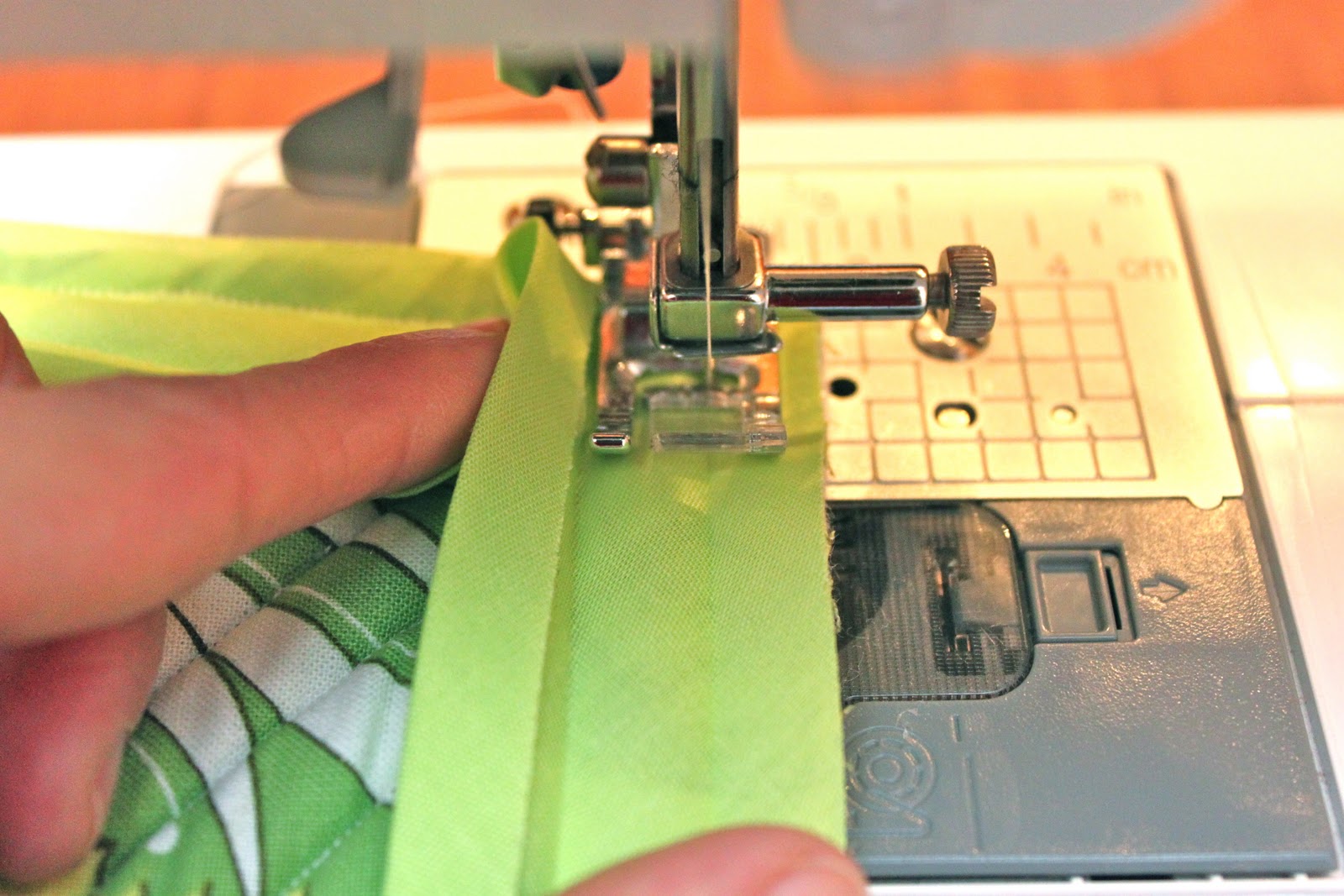 Sew down the crease of your bias tape until you get about 1/4 inch from the edge. Backstitch and cut your threads being careful not to cut your bias tape.