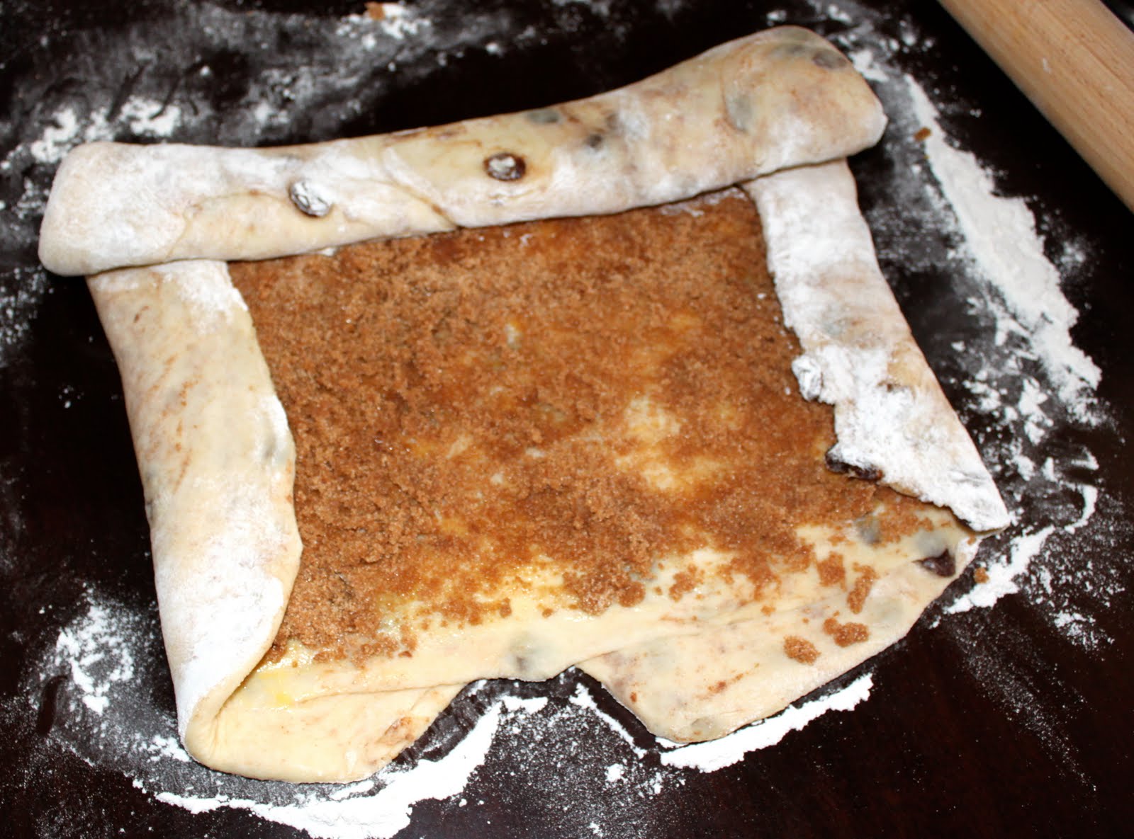 To make filling: Mix sugar and cinnamon with 2 tablespoons water in a small bowl. Place dough on lightly floured surface an divide in half. Roll out one half to a 12 x 10 inch rectangle. Brush with beaten egg and sprinkle with half the filling. Repeat with the other half of dough.
