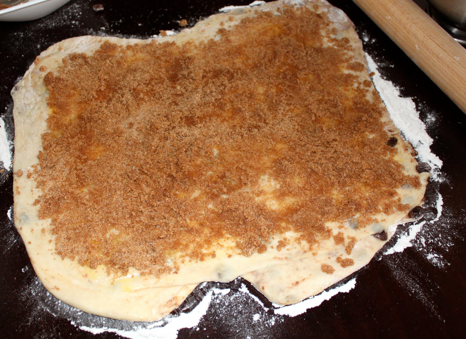 Turn dough out onto a lightly floured surface. Pat dough into a 9-inch round (about 1 1/4 inches thick) and sprinkle with raisins and cinnamon. Knead dough until incorporated. Place dough in lightly oiled bowl and cover with oiled plastic wrap. (I just sprayed cooking spray in the bowl and on the plastic wrap.) Let rise in a warm place until doubled in bulk, about an hour.