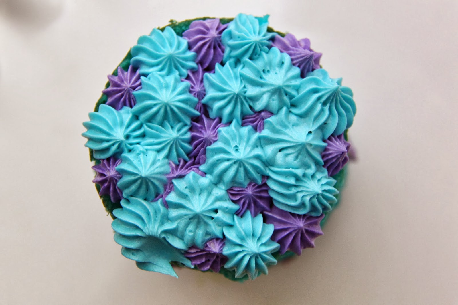 To frost, use a basic buttercream (or even a store bought frosting) recipe and divide the frosting between four bowls. One you will color aqua, one purple, one white and a leeetle bowl black…I changed my mind from the picture above and decided to use white instead of lime green for Mike’s cake as I liked the contrast better.