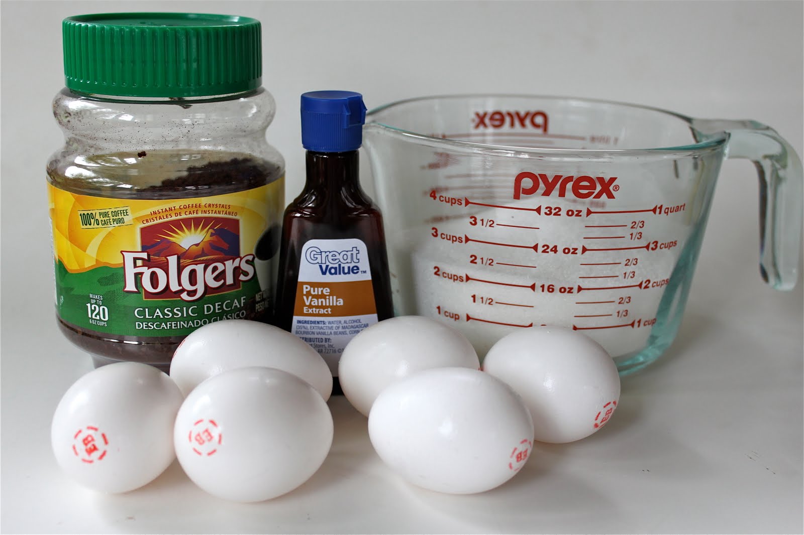 - In a large bowl, stir together eggs, coffee granules, vanilla and sugar.