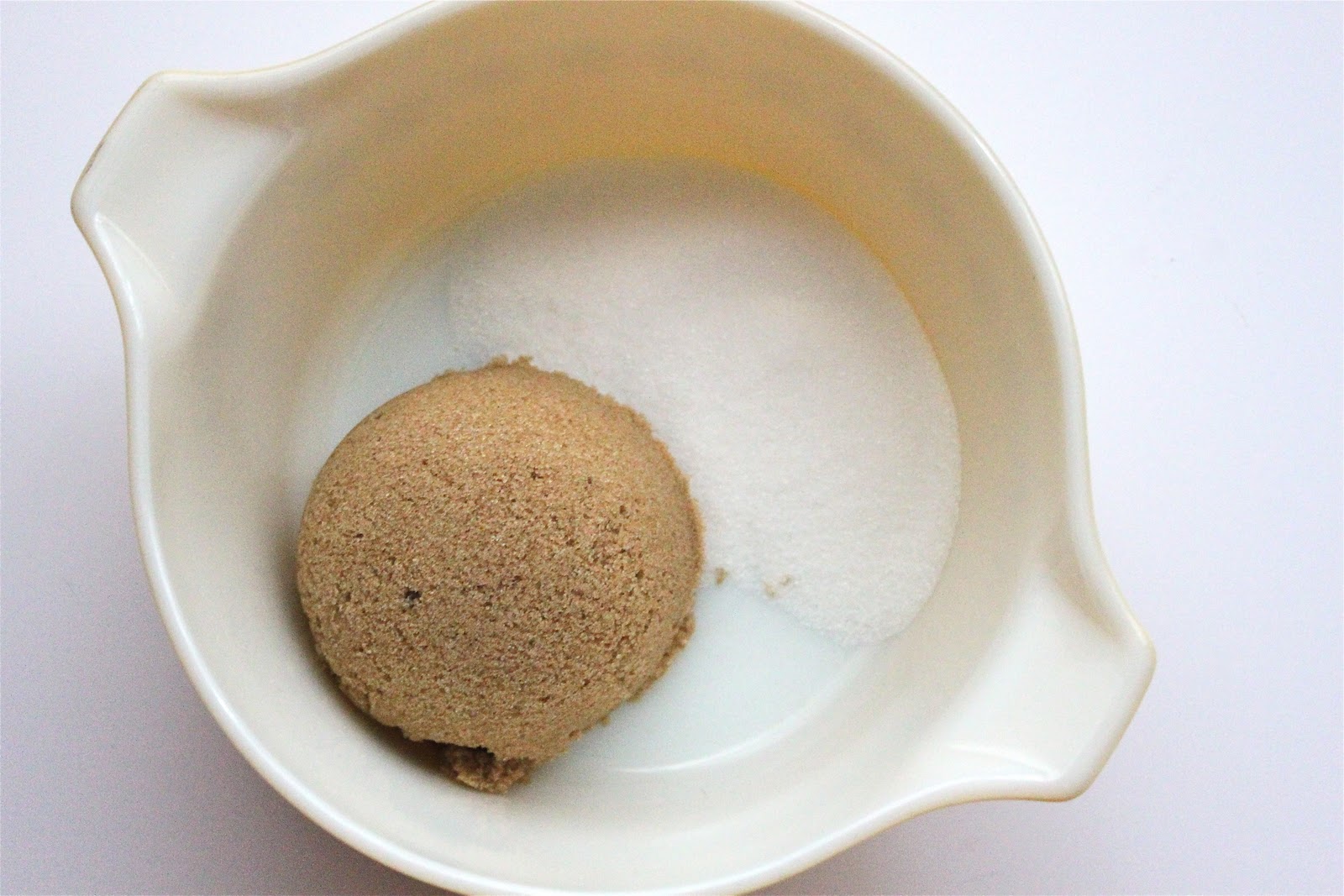 Then you are going to measure 1 cup of light brown sugar and 1/4 cup of white sugar…