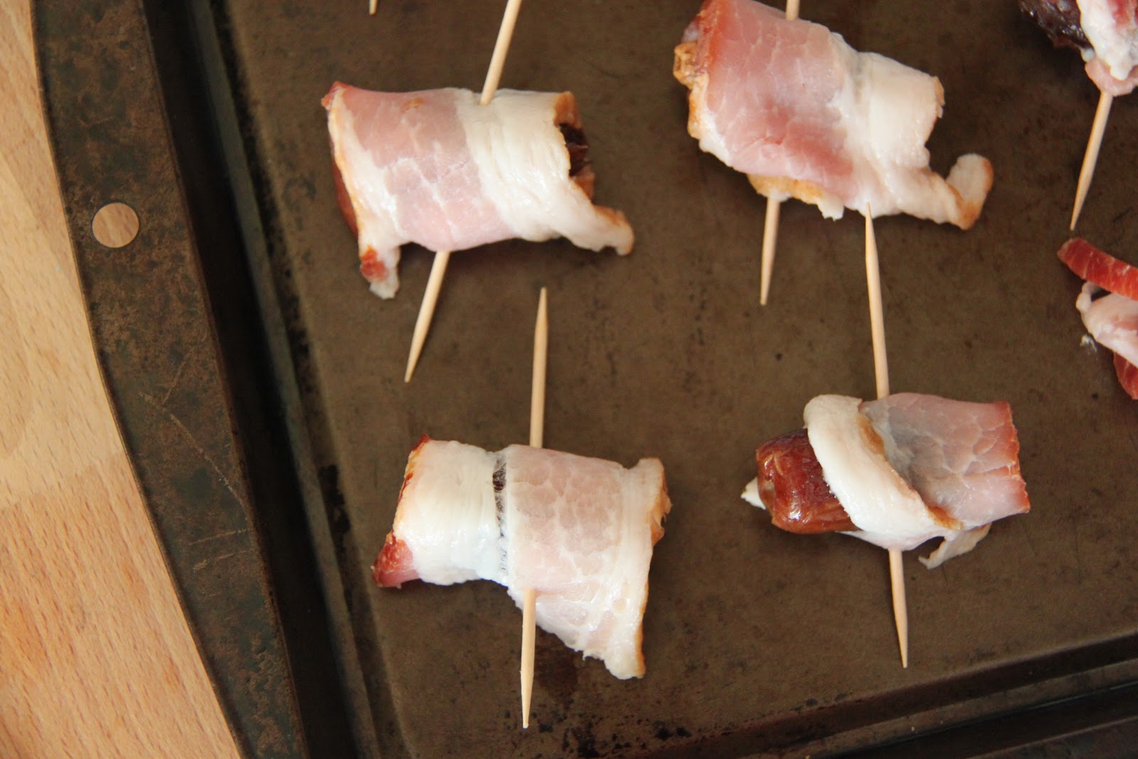 - Wrap one piece of bacon around a pitted date and pierce with a toothpick to hold it in place.