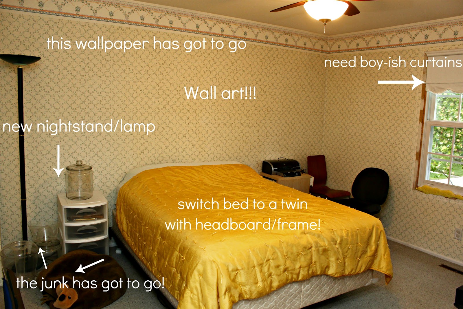 3. The makeshift nightstand will go bye-bye and we’ll replace it with something more “Noah.”