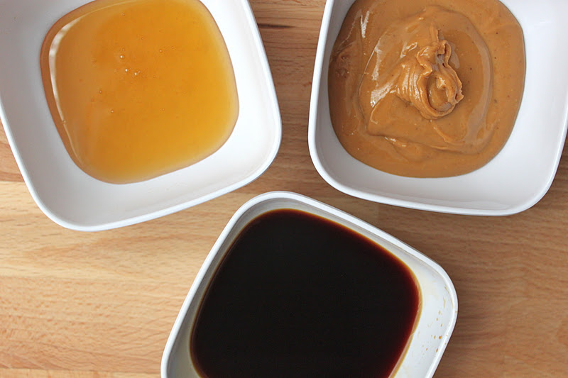 Then while the water is boiling, in a small saucepan add in the honey, peanut butter and soy sauce. If you want to skip a step and don’t want to add crushed peanuts at the end, you can just use crunchy peanut butter instead…an easy peasy substitution!
