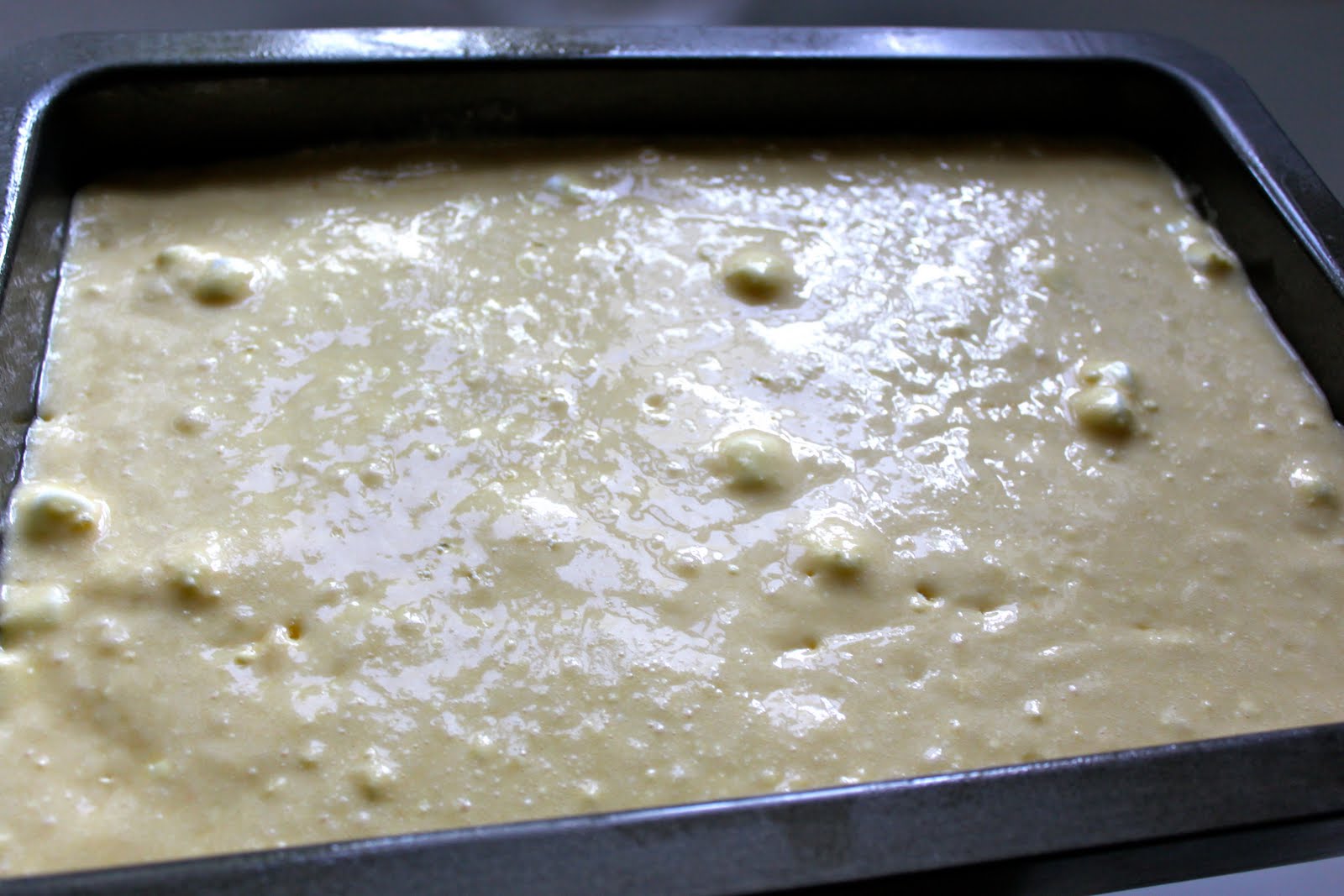 Then, pour your yellow cake batter on top of that layer…whew, we’re really doing the layers…your still with me, right!