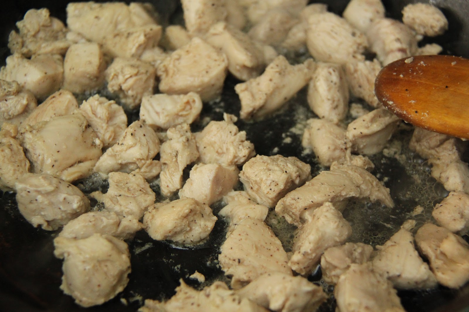 - While you are waiting for the oil to get hot, cut the chicken breasts into 1-2 inch pieces and season with salt and pepper.
