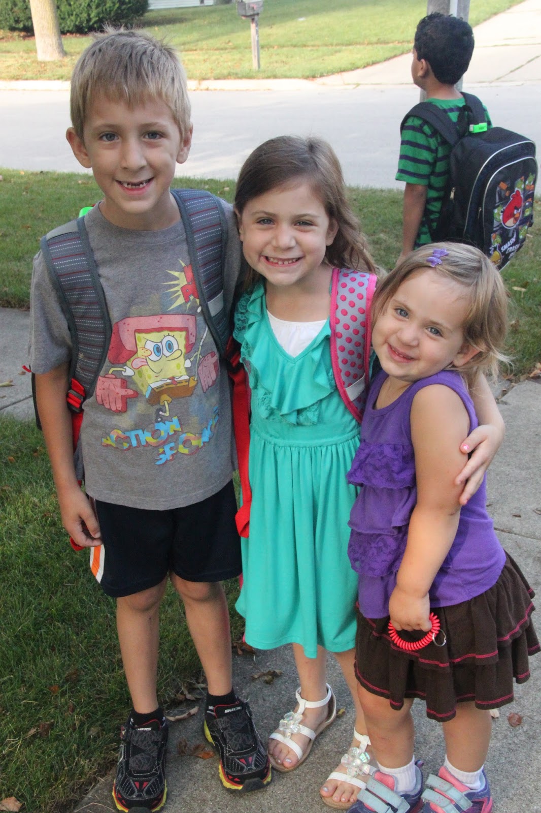 How cute! My oldest 2 are in 1st and Kindergarten this year too. In Michigan KDG does a staggered started. About 1/3 of the class goes each day until Friday (we start the Tuesday after Labor Day)and then they put the whole group together.