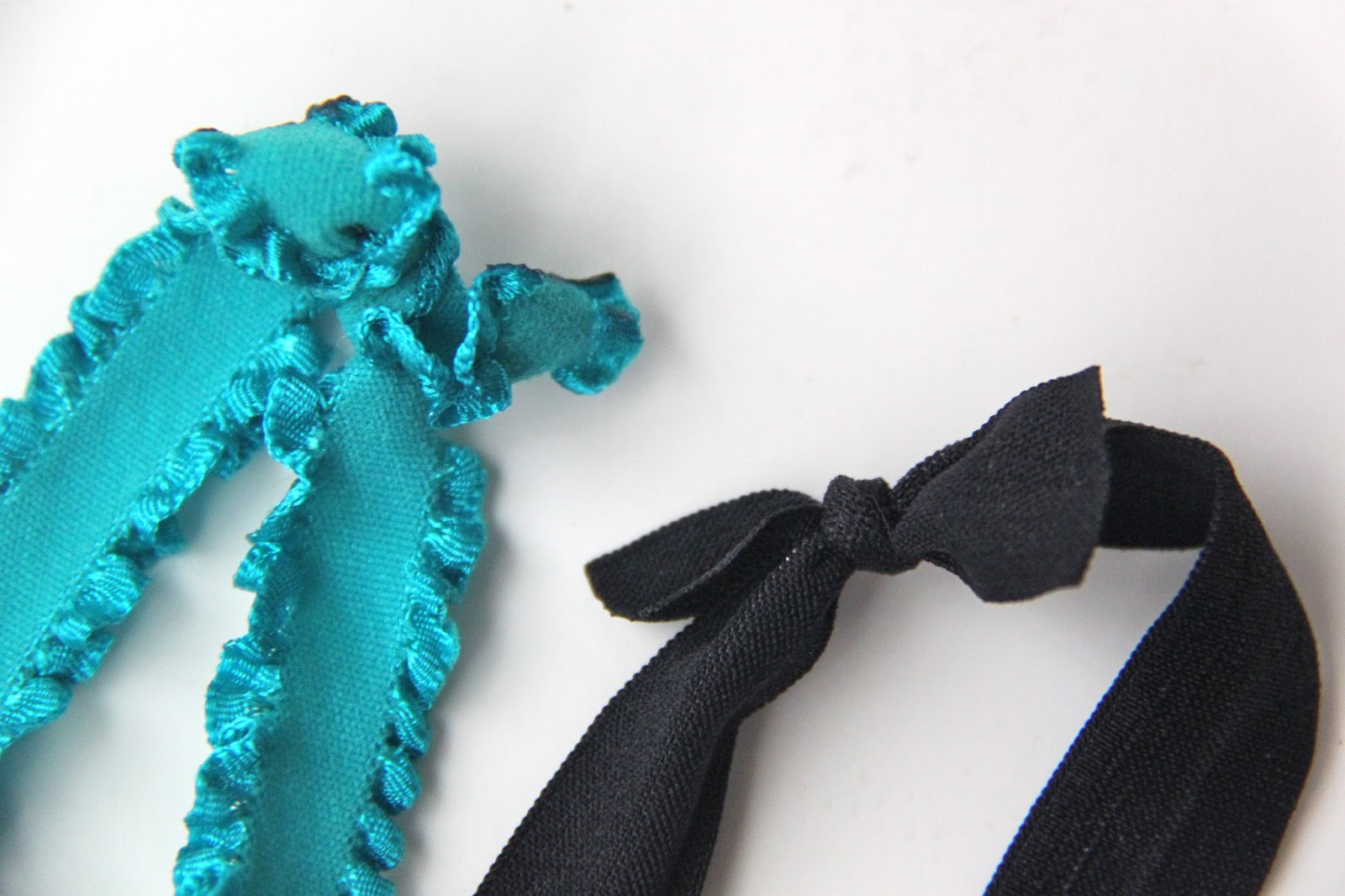 I was at Jo-Anns a while back I came across a whole array of fun-colored Ruffle elastic and Fold-Over Elastic, they just started stocking it earlier this year, yahoo! Have you ever used this stuff? It is awesome, fold-over elastic (FOE for short!) has sooo many uses…but we can talk about those in another post. Anyways, I realized that it had the perfect elasticity for headbands…not too strong and not too weak…so I picked up a bunch of it and promptly made the girls and I a whole bunch of fun hair accessories for less than a dollar a piece! PS. these also make great hair ties too!