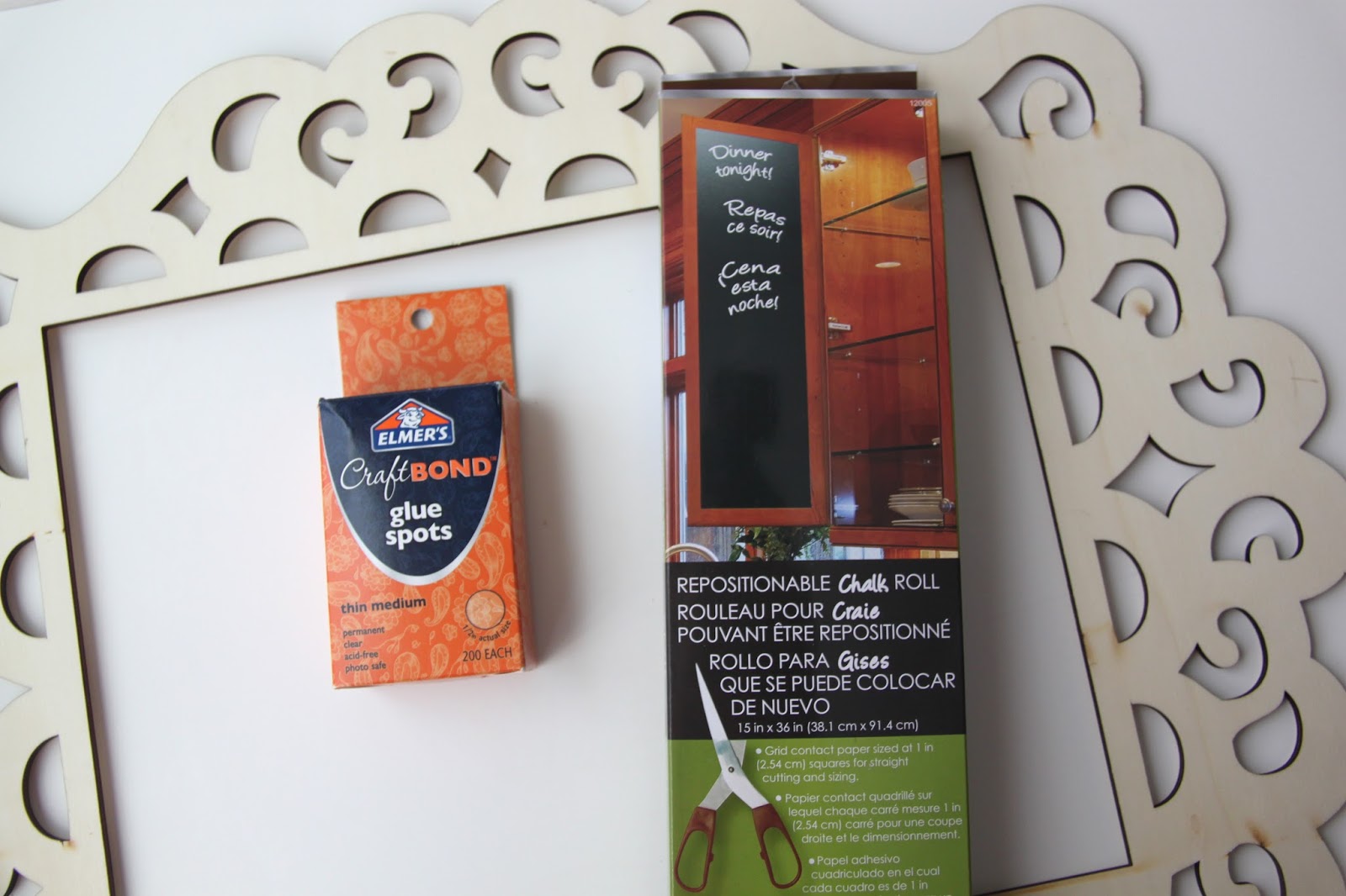 Once the paint is dry to touch, flip the laser cut frame over and use glue dots or super glue and glue all around the backside edge (like photo above). Cut your Chalkboard Vinyl to size. Try to cut it so that you don’t have any of the vinyl showing through the cut out holes from the front side! Place the chalkboard onto the glued edge you just created and press firmly.
