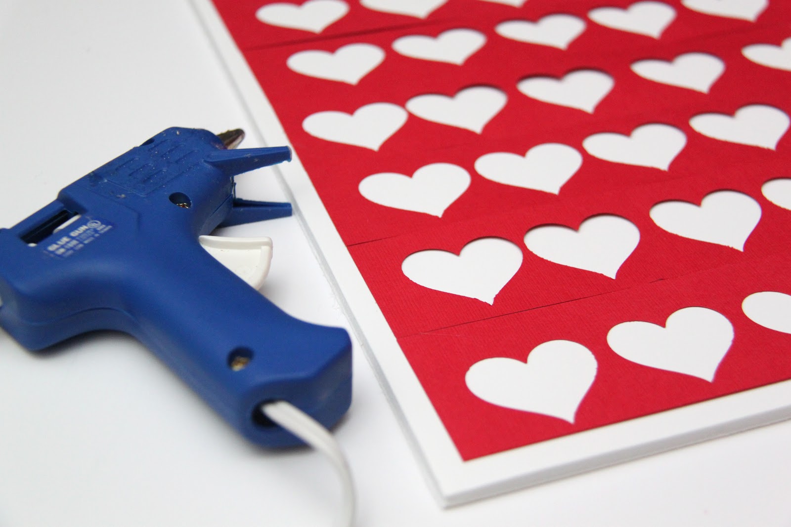 Then, take your other color of scrapbook paper and punch out a single heart. Hot glue it down into one of the empty hearts…whichever spot you choose.