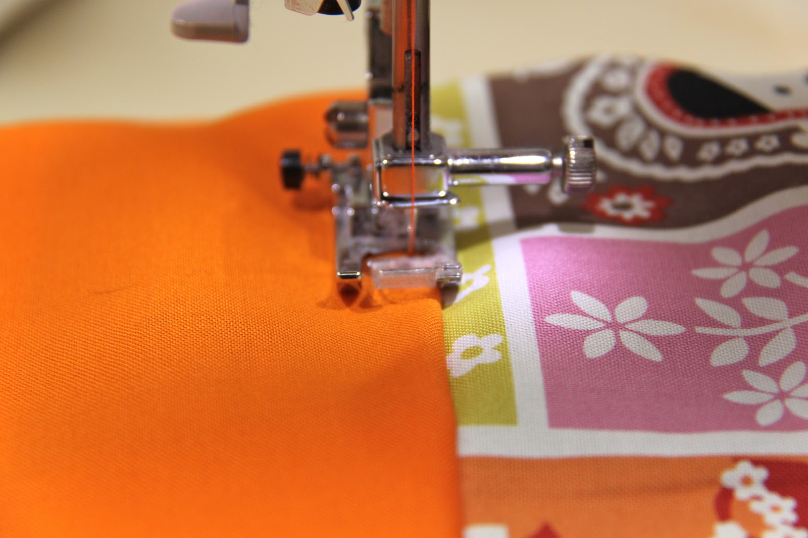 Next, place the two fabrics (orange and main fabric) right sides together a the top edge of the main fabric. Sew together using a 1/4 inch seam allowance. You can finish the seam any way you like, I serged mine.